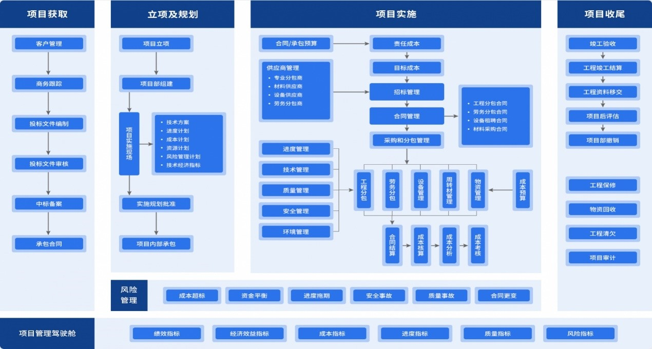 涵盖企业经营、项目管理、现场管理、成本管控、多方协同,为施工企业提供项企一体化业务、数字平台;