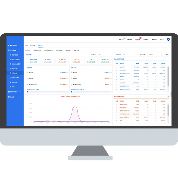 合同总览,对公司和项目的收入合同、支出合同进行收支管理,展示收入合同执行情况、支出合同执行情况; 供应商账款分材料、劳务、机械、周转材、分包、间接费等单列与汇总。销项发票和进项发票统计。